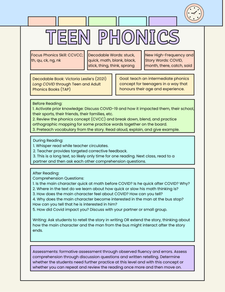 Decodables for middle school level can be a major challenge. Teenagers are hyperaware of anything that seems babyish. Decodables have an important, if short, role in giving students success in reading the phonological patterns that they have mastered. Being able to read connected text gives them confidence to continue in their reading journeys. As such, finding relevant decodables that consider the identity issues and themes of teenage life is important. There are different options available, including the Teen and Adult Phonics Books (TAP). Teachers and librarians can also write their own, though this is of course more labour intensive. Here is an example of a teen phonics lesson using decodables.